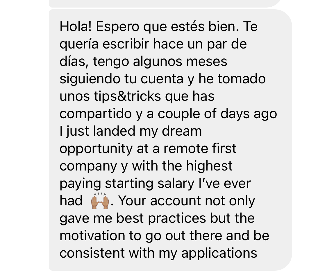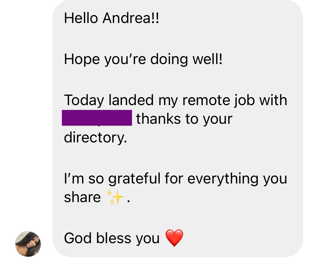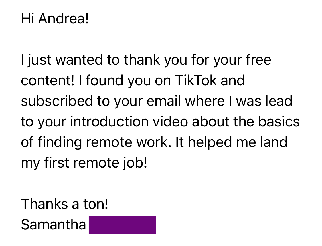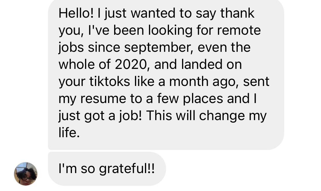 I started helping my followers go remote back in 2019. My first true success story was my own brother, who was able to get a remote job with no degree, experience & at only 20 years of age. Once I used my method with him, I knew I could continue using it to help others go remote, as well.