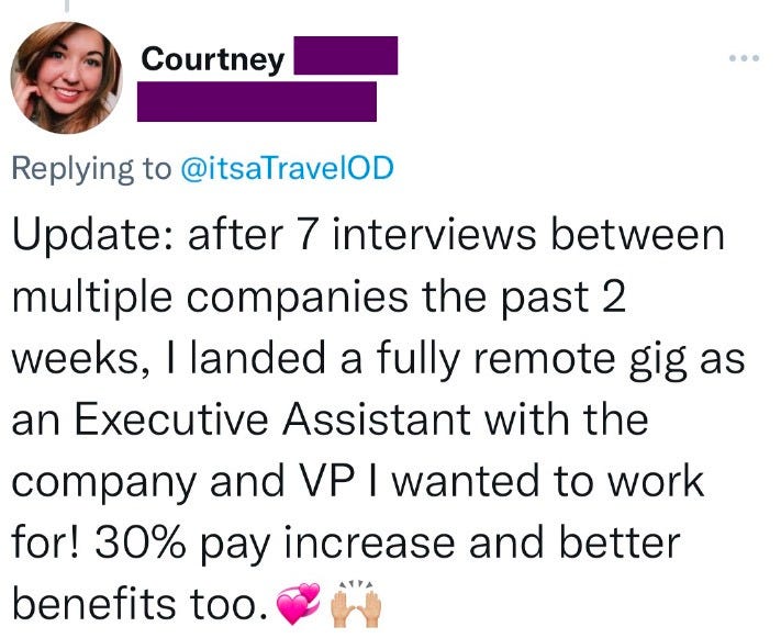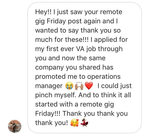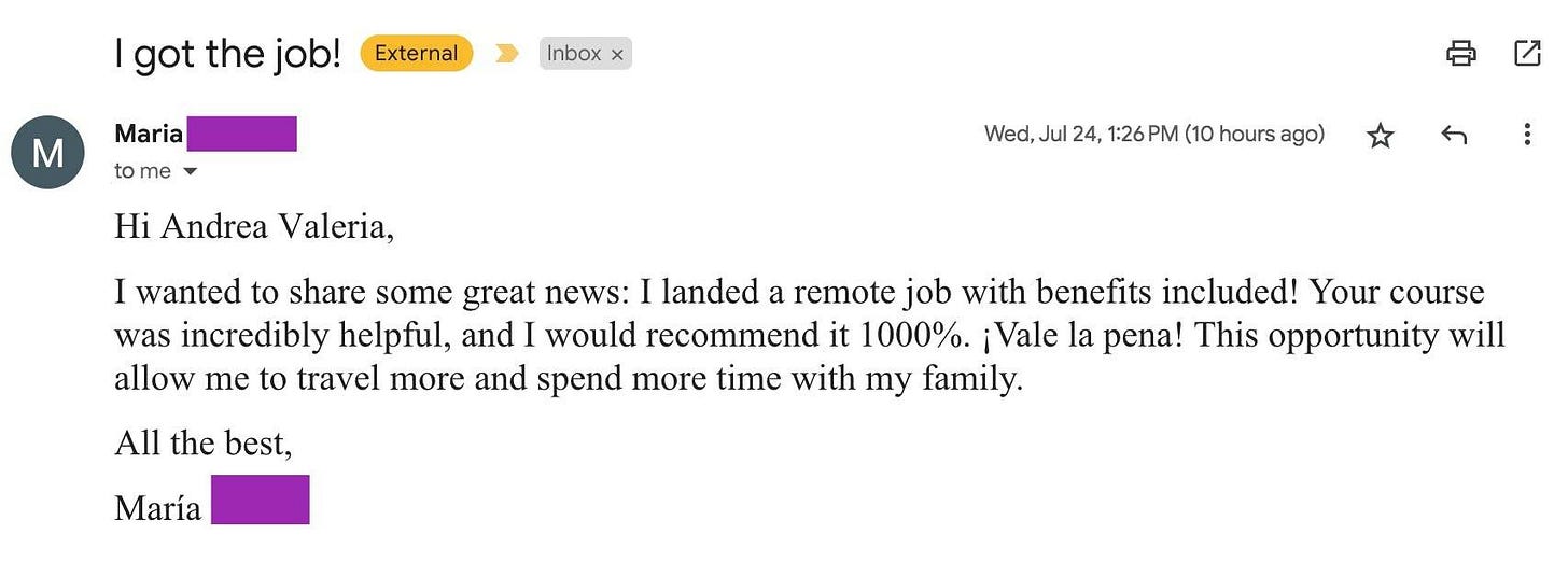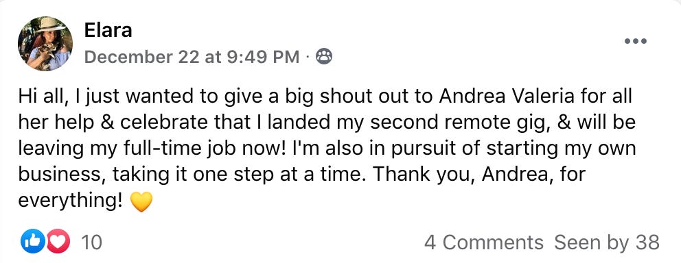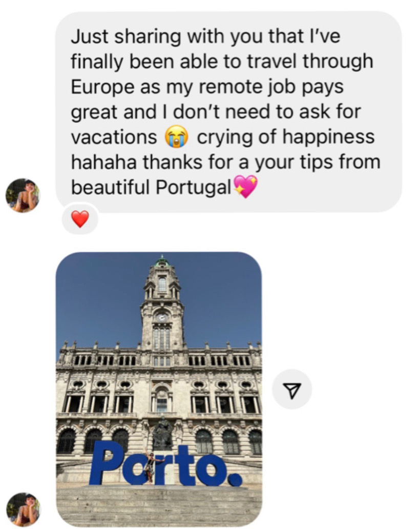 So, below I’m sharing some of the stories, screenshots, wins, and little life upgrades that happened after these people decided to actually go for it. Some joined my full program, some used my ‘Remotify Your Resume’ service, some followed the strategy I share here on Substack or participated in one of my challenges…