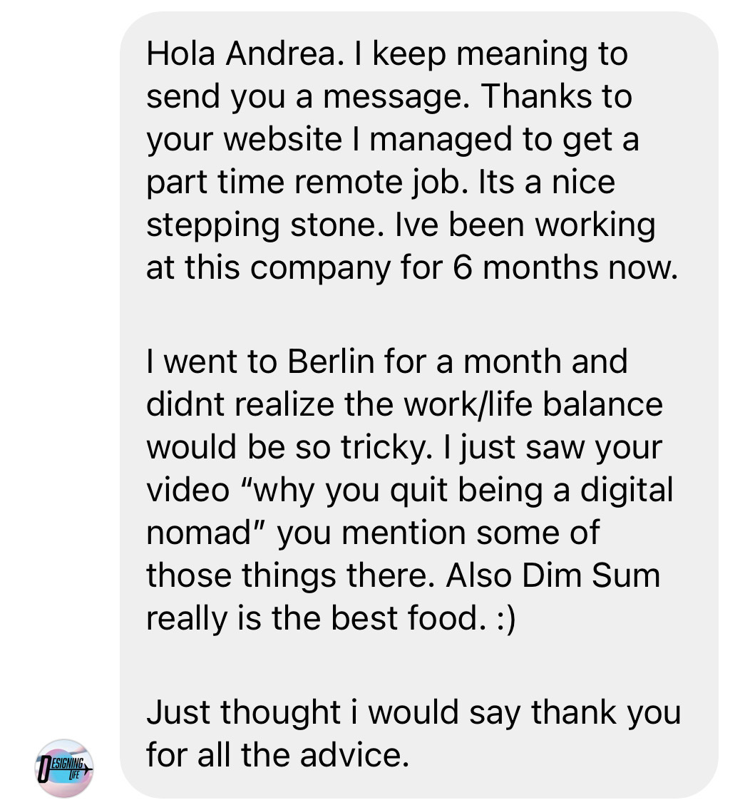 That’s when she started working remotely after joining my course ‘Land Your First Remote Job’ & sending me this email one day when she was literally working from the beach.