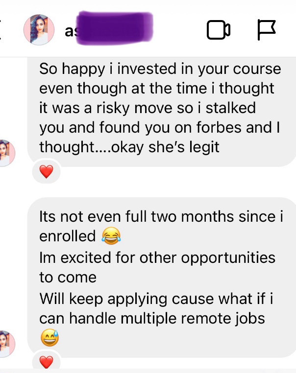 She completed my course ‘Land Your First Remote Job,’ too.