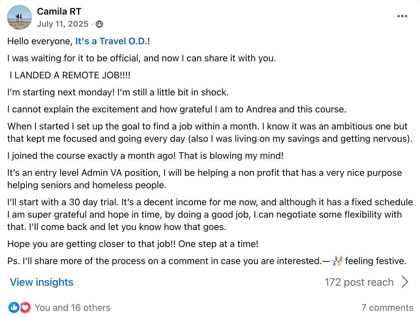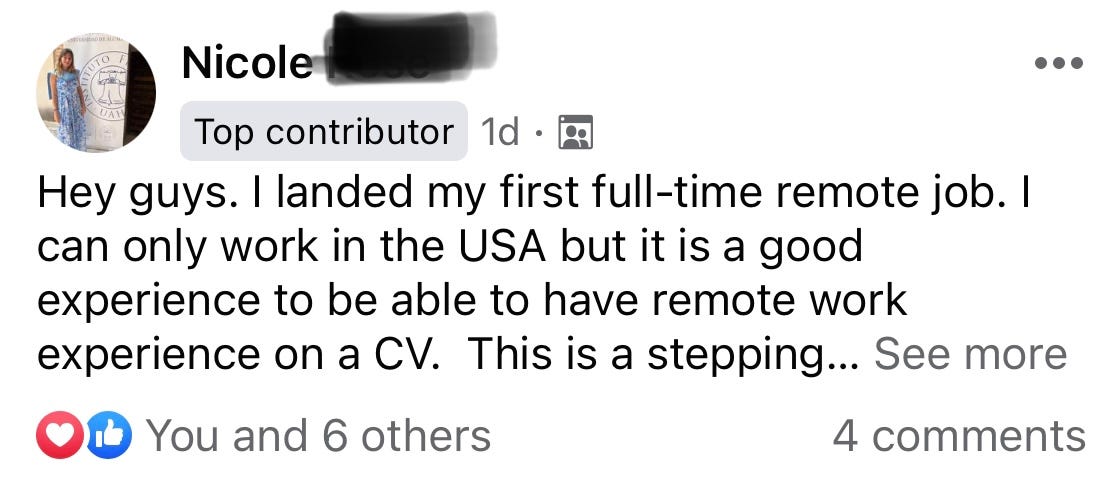 She joined my course ‘Land Your First Remote Job’ & got a remote job I posted in the exclusive FB group for course members to start her remote work journey