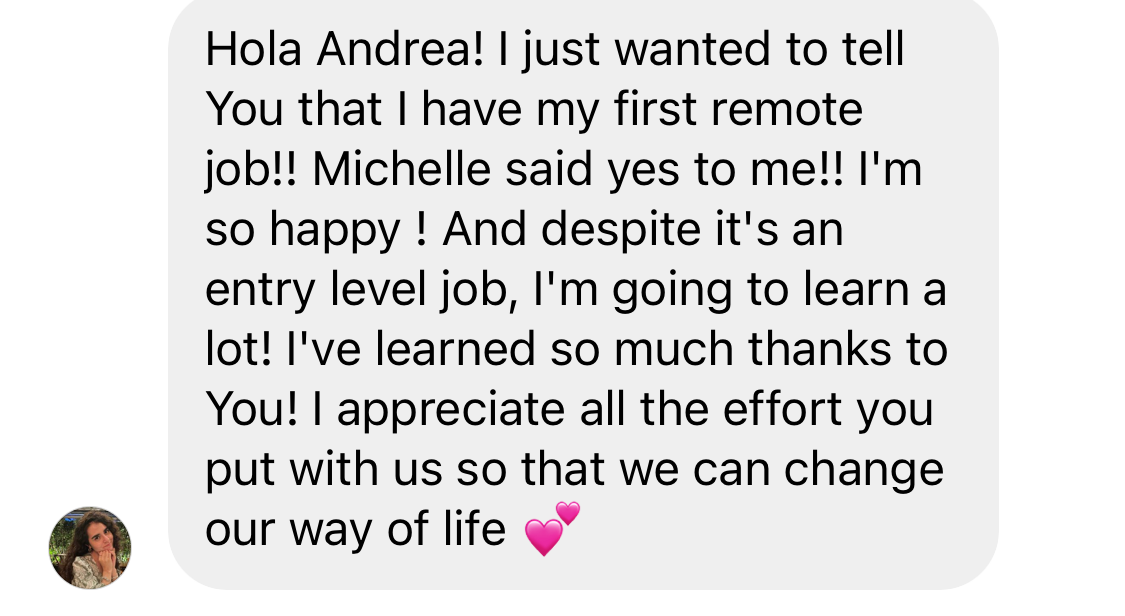 That happened 4 months after she joined my full course ‘Land Your First Remote Job’